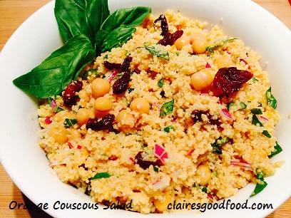 With chick peas, dried fruit and couscous, this citrusy salad can serve as a main dish. |