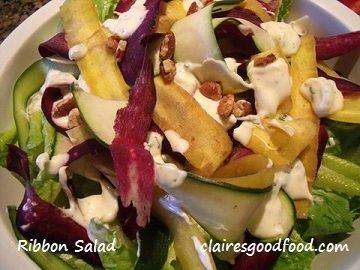 Ribbons of heirloom carrot and summer squash tossed with yogurt and chive dressing make a pretty side dish. |